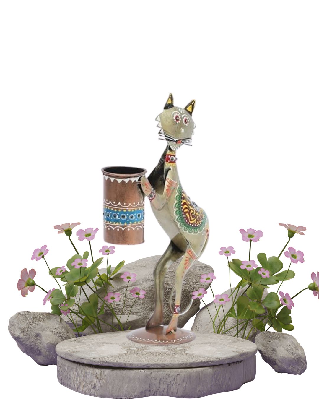 Add a touch of whimsy and charm to your workspace or home décor with this Iron Cat Holding a Pen Holder Showpiece. This handcrafted piece features a playful cat figurine made from durable iron, cleverly designed to hold a pen or small accessories. Hand-painted with care, it brings personality and artistic flair to any desk, shelf, or tabletop.